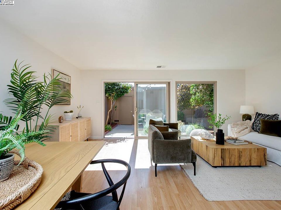 Located in Bay Farm Island's well-established Islandia HOA community, this beautifully updated two-story townhome features 2 BR, 1.5 BA, an open LR/DR/kitchen, laundry room, detached 2-car garage and a sunny patio + garden w/mature landscaping. The contemporary open floor plan is enhanced by sliding doors that provide bright, natural light and seamlessly connect the interior to the private patio & attractively landscaped garden. Details include wood-like floors, refreshed interior paint + new lighting throughout. The main level 1/2 bath has been remodeled w/attractive modern finishes, and the newly updated kitchen includes quartz counters, a new range, an LG refrigerator and Bosch dishwasher. The primary bedroom has a vaulted ceiling, a double closet w/custom organizers, plus a gorgeous ensuite bathroom with an oversized wet room-style shower with a soaking tub inside. The large detached garage (429 SF, measured) provides a flex space for parking, a workshop or additional household storage. Situated just minutes to highly ranked schools, parks, playgrounds, Harbor Landing shopping & the SF Ferry for an effortless ride to San Francisco. HOA amenities include a community pool & clubhouse. Enjoy resort-like living from this move-in-ready home in a desirable Bay Farm location!