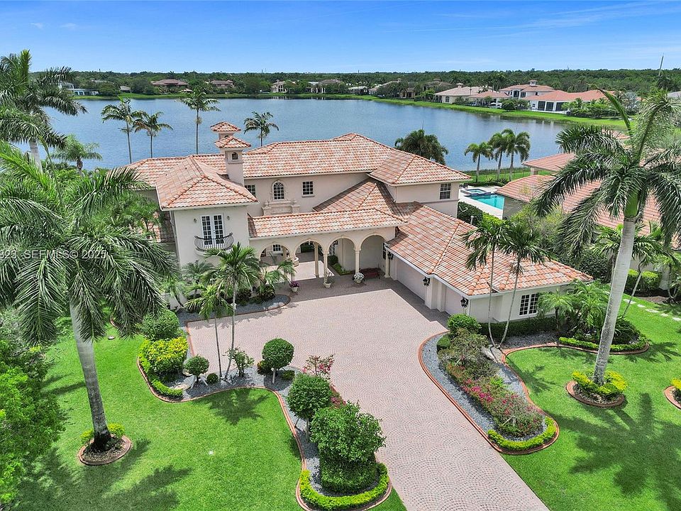 Mediterranean-inspired estate set on long, peaceful lakefront in the gated community of Windmill Reserve. This 6-bedroom, 7.5-bath residence offers more than 8,500 sqft of elegant living space with grand living room centered around marble fireplace. Chef’s kitchen features oversized center island, Sub-Zero refrigeration, gas cooktop, wall oven with warming drawer, breakfast area, and dedicated wine storage room. Spacious butler’s pantry and oversized laundry room sit nearby for added convenience. First floor includes billiard room with full bar, formal dining room, spacious family room, full guest bath, powder room, and additional first-floor office separate from private office located within primary suite. Primary suite occupies its own private wing with media room, sitting area, dual walk-in closets, dual powder rooms, spa-style bath, and direct access to outdoor areas. Upstairs, 4 additional ensuite bedrooms with walk-in closets, open hallway overlooking living areas below to create a bright, connected second level. Outdoor living is designed for year-round enjoyment with long lake views, heated pool with water feature, and summer kitchen enhanced with roller shades for comfortable, shaded entertaining. Additional upgrades include full impact windows and doors, new electric wiring and circuit breaker, elevator, Savant sound system, and oversized 3 car garage. This residence blends space, function, and refined living in one of Weston’s most desirable luxury communities.