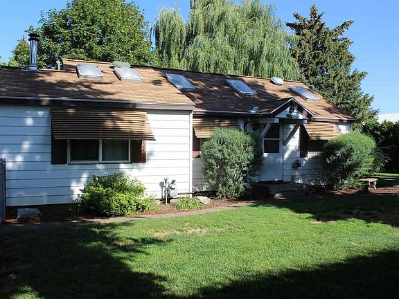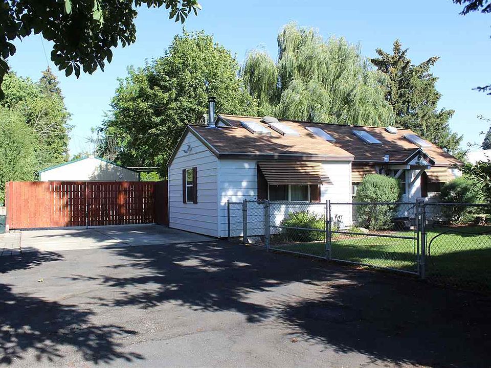 Cozy home that sits on over 1/3 acre across from Felts Field. Plenty of room for the toys! Shop, RV parking with 30 amp hook-up. Landscaping offers privacy, covered patio great for bbq's and entertaining, and fully fenced front and back yard. This 1 bedroom home has loft space and partial basement. Features wood and pellet stoves, oversized jetted tub, skylights, vaulted ceilings and all appliances stay. Home sold "as-is" needs some finish work.