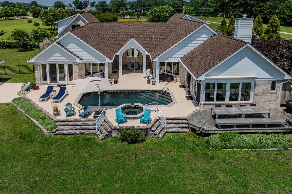 'COASTAL BREEZE’ on the Rappahannock spans 4.63 level acres of beautifully landscaped waterfront, offering wide, unobstructed vistas of the Rappahannock River and into the Chesapeake Bay. Mesmerizing views greet you immediately upon entry, drawing your eye toward the pool and waterfront beyond. Designed for gracious one-level living, this custom residence showcases fine finishes and a seamless blend of indoor and outdoor spaces. See video for expansive FLOORPLAN DETAILS, including bonus areas. Architectural-style windows frame the water from nearly every room. Australian Cypress flooring and custom tile add warmth and character throughout. The chef’s kitchen is anchored by a grand island—ideal for gathering or dining—and features glass-front cabinetry flowing openly into the dining area, warmed by a wood stove. A sun porch with wet bar extends the living space and opens directly to the saltwater pool, spa, and expansive stamped concrete patio. A serene primary suite offers a spa-inspired bath and private access to the patio, while there are multiple additional spaces to accommodate extended guests and family—including a family/media room—enhance both daily living and entertaining. Two attached two-car garages provide generous storage and flexibility. Above one is a spacious studio bunk suite with its own deck and private entry—perfect for guests or multi-generational living. The unfinished space above the second garage is well-suited for an art studio, office, or fitness room. This coveted vantage point captures one of the Bay’s most timeless panoramas and includes 9.74 acres of DEEDED KING'S GRANT OYSTER GROUND just off the shore and in NO FLOOD ZONE—a place where luxury, privacy, and natural beauty converge.