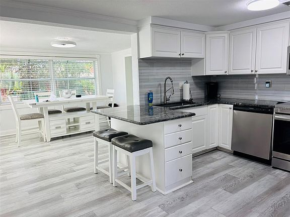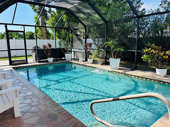 Welcome Home! This beautifully updated pool home features two bedrooms, one bathroom, and a layout designed for easy living. Step inside to a spacious living room with newly installed laminate flooring and abundant natural light. The custom kitchen offers modern charm with stylish cabinetry, stainless steel appliances, and a convenient breakfast bar. Enjoy meals in the adjoining dining area, or take the gathering outdoors to the screened-in porch where you can relax in the fresh breeze. A versatile den/office space provides additional comfort and flexibility to suit your lifestyle. Attention to detail shines throughout with custom moldings and thoughtful finishes. The screened-in pool area is a true highlight—complete with color-changing lights and a tranquil waterfall, it’s perfect for both relaxing and entertaining. Beyond the lanai, the fully fenced yard offers privacy, mature landscaping, and plenty of space to enjoy the outdoors. This home combines comfort, style, and functionality—ready for you to move in and enjoy.
