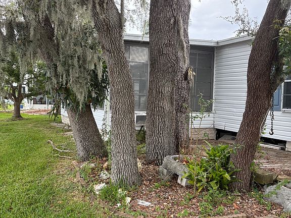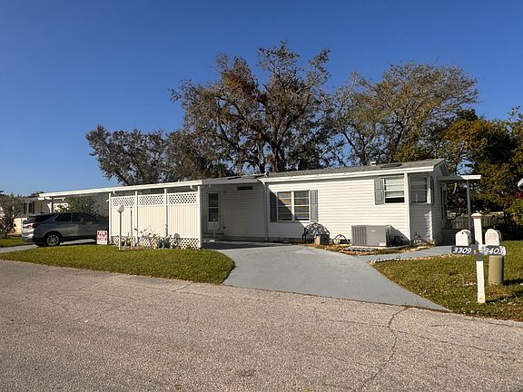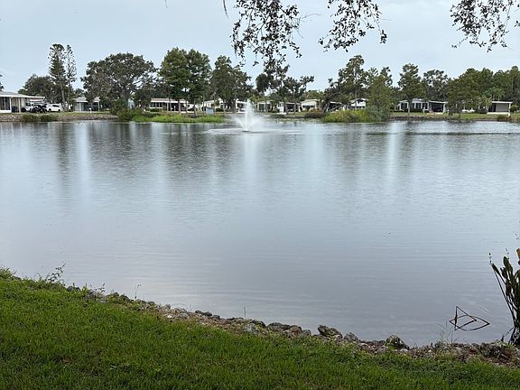 Very spacious, open floor plan, two-bedroom two bath home in Ridgewood Estates. The home is nestled on a beautiful lake and has mature oak trees. The half circle pull through driveway, includes a carport and golf cart garage, providing ample parking space. Newer roof, hot water heater, carpet, and freshly painted. A large heated and cooled enclosed lanai is perfect for family gatherings or for just relaxing and enjoying nature. Ridgewood Estates is a gated, 55+, lot leased community with two pools, a clubhouse, and many more amenities.