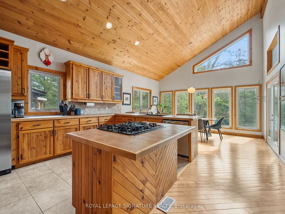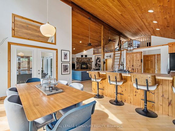 WATERFRONT HOME. *ALL FURNITURE INCLUDED. Experience the tranquility of waterfront living with stunning elevated views from this beautiful home located on the Severn (Green) River in Washago. This inviting residence features three large bedroom sand three baths, providing ample space for family and guests. The light-filled open-concept great room seamlessly connects to the kitchen and dining area, showcasing a striking cathedral tongue and groove pine ceiling complemented by hardwood and ceramic floors. A cozy corner wood fireplace adds warmth to the living space, perfect for relaxing evenings. The versatile upper loft offers additional living space that can be adapted to suit your needs, whether as a home office, play area, or guest retreat. Spacious bathrooms featuring large tiled walk-in showers for a touch of luxury. Enjoy effortless outdoor living with walkouts that lead to a tranquil screened-in porch, where you can take in the amazing views. The property boasts 81 feet of waterfront, complete with a dock for your boating adventures and a detached garage for convenient storage. Currently operates as a short term rental. Don't miss the opportunity to make this stunning waterfront home your own and embrace a lifestyle of peace and beauty on the Severn River! Don't miss the virtual tour! + rental income available.