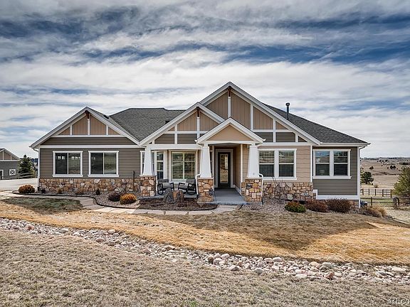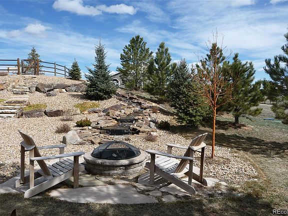 Welcome Home to the best of Colorado country living! Lovely ranch home w/finished walk-out basement on 5 gorgeous acres just 2 miles from historic Elizabeth. Charming front porch welcomes you in - gather around the great room fireplace, create a feast in the beautiful open kitchen with breakfast nook overlooking the gorgeous back yard. Dining area has view of the treed front yard. Delightful Master suite, 2 additional bedrooms & full bath, laundry complete the main floor. Many recent upgrades including remodeled kitchen, new flooring and quartz counters in master bath, new carpet , new flooring in basement. Walk-out Basement has a 4th bedroom, full bath, large rec/family room with gorgeous luxury vinyl plank floor, kitchenette, and a flex space perfect for office or workout area. Topnotch Pottery Barn pool table included. Deck has new pergola, railing & trex-type decking. At walk-out level - extended patio, fire pit and amazing 35 ft waterfall stream complement the outstanding PRIVATE back yard area with it's trees & gorgeous views - outdoor living at its best! End of court location backing to 35 acre property = big view of fields, pines & Pikes Peak. One acre fenced, grass, shrubs and 40+ trees - truly an oasis! 28X24 Barn with loft - easily add horse stalls, or create your workshop. Chicken coop & garden area. Wild Pointe Ranch has trails & open space - ride your horse, take a hike, enjoy the views. Schools, shopping and many services are nearby. Paved Driveway & roads, reasonable commute to many work centers. Make this YOUR DREAM HOME!