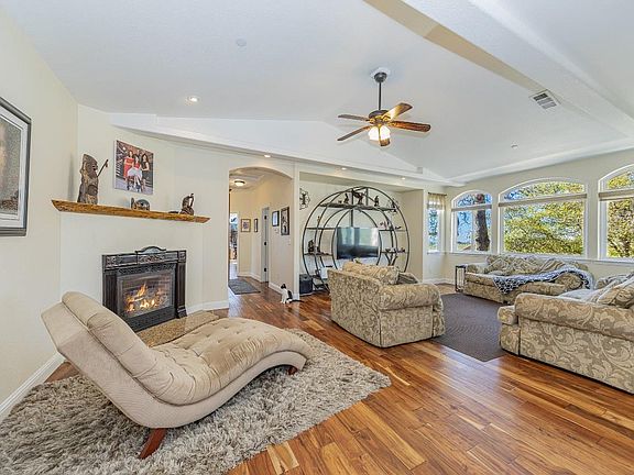 Exquisite Custom Home! A one of a kind from top to bottom that is a real showpiece w/great thought & care in the design & use of materials throughout. From the gated entry to the grand entry w/a circular staircase leading to the primary suite, there is so much to see in this home. Acacia floors throughout w/sealed aggregate flooring in the kitchen & BAs for easy clean up. A very lg. gorgeous kitchen w/an island for eating or just chatting w/friends while you cook those scrumptious meals, makes for a fun time entertaining friends or family. A step-down living room & propane fireplace add an air of comfort w/the design, all while having easy access to the formal dining room & kitchen. As you stroll down the hall you will come to the other BDs, BAs & the oversized game/family room w/plenty of room for a pool table, bar, or dance studio space. Just let your imagination run wild. Be sure to go up to the primary suite & stroll out to the oversized partially covered patio to sit & relax or add a private spa there. The primary BA is very spacious & the huge walk-in closet that feels like it just keeps going. As you look over this 2.51+/- acre property, you will see the land is all usable, fenced, cross-fenced w/chicken coops, storage building, lg. gazebo on the back side of the home w/built-in barbecue & so much more. Tankless water system, wired for generator, security system, built-in wall safe & cameras & oversized garage w/additional 10x13 workspace.