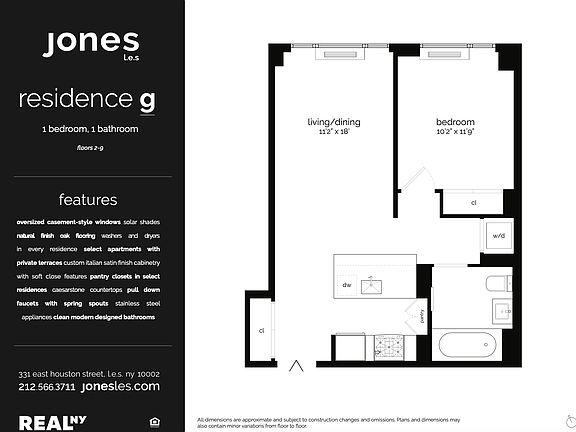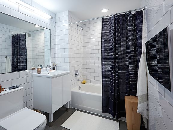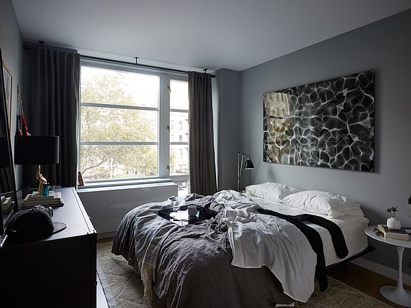 A full sized washer and dryer, top-of-the-line stainless steel appliances, including a dishwasher and microwave. The kitchen also has custom Italian satin finish cabinetry with soft-close features. The bathroom is surprisingly spacious with a deep soaking tub and built-in grooming station. This intelligently designed apartment has floor-to-ceiling windows and unbeatable closets. Bedroom will fit a queen sized bed and has a walk in closet. The unit is rent stabilized.