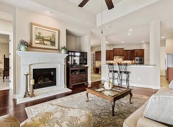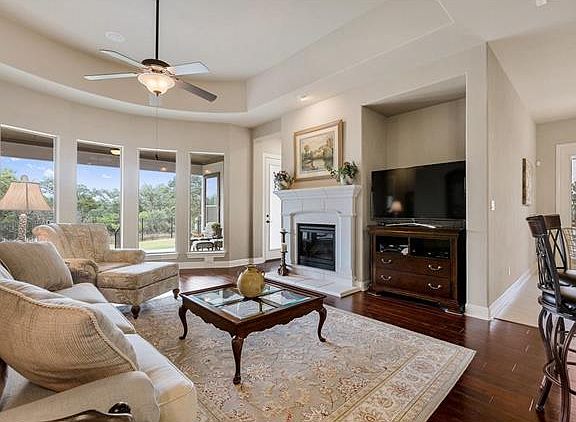Lightly lived-in and meticulously maintained this one level home includes numerous upgrades and is ready for immediate move in. Upgraded granite in kitchen and master bath, wood & tile flooring, plantation shutters, gas log fireplace, stainless appliances, oversized kitchen island and much more. The spacious flat backyard backs to the green belt providing privacy and outdoor living at its finest.