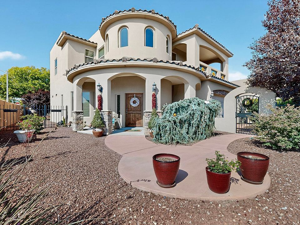 Simply STUNNING high-end Southwest contemporary home that embodies elegance and sophistication. This exquisite property boasts an abundance of natural light, highlighting the quality craftsmanship and meticulous attention to detail throughout. The thoughtfully designed floor plan with soaring raised ceilings enhances everyday living, featuring a gourmet kitchen that is an entertainer's dream. It seamlessly blends form and function, featuring stainless steel appliances, ample counter space, beautifully designed cabinetry, and a cozy nook area. The spacious and secluded master suite includes a private balcony that offers breathtaking views of the serene bosque and Downtown ABQ. Perfect for both relaxation and hosting gatherings. See this home today & thank yourself tomorrow!