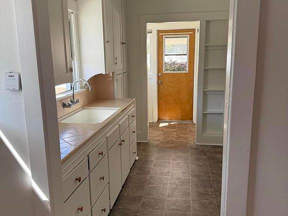 Spanish bungalowFarmhouse sinkStand-alone homeCrown moldingRefreshed bathroomGlass shower doorsClassic tile countertops