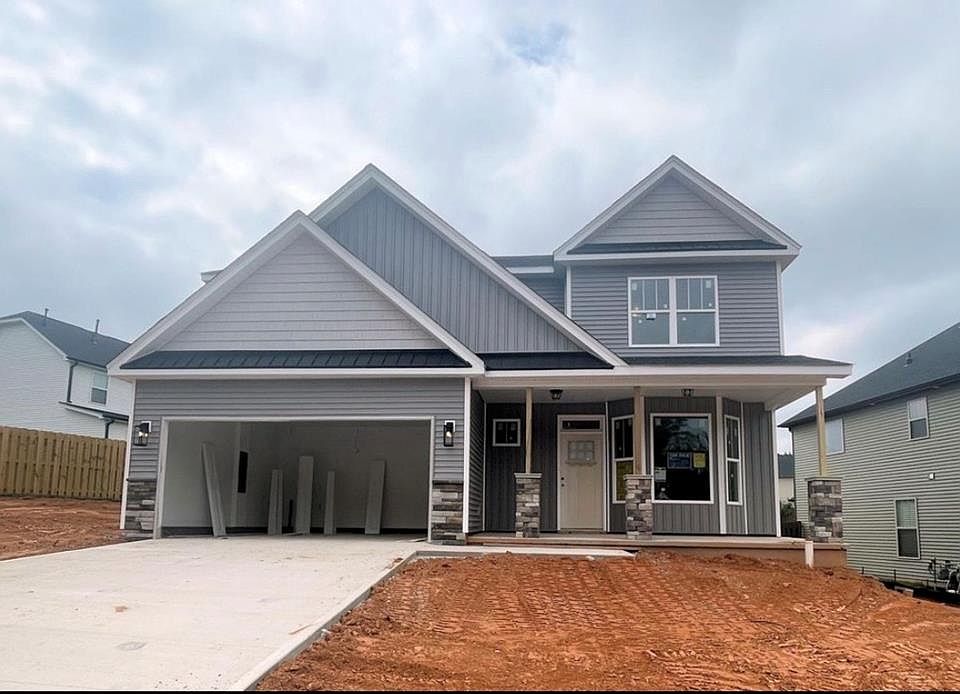 Huntington model in River Trace! Home boasts 4 bedrooms, 2.5 baths, approximately 1925 ft.. Home has smart home manager package, two car garage with opener and two remotes, 12 x 12 concrete patio. Roof has architectural shingles. Sodded lawn with irrigation system, gas log fireplace with raised hearth and stone to mantle, luxury vinyl plank flooring around main level, and oak stair treads. Home features 9 foot ceilings on main level. Kitchen features 42 inch flat panel cabinetry with large cabinet crown molding, and knob/pulls. Kitchen has upgraded granite countertop, ceramic tile, backsplash, and stainless steel appliance package. Quartz vanities in baths, double sinks, and garden tub with separate shower and master bath.