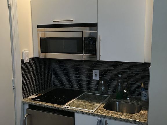 Tranquil streetFreshly renovated kitchenetteHardwood floorsCeramic subway tilesTwo-burner stoveMarble flooringGranite countertop