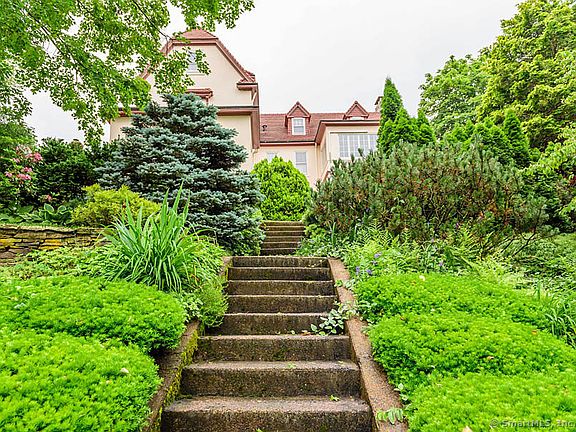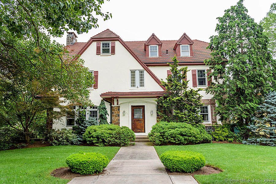 One of the finest examples by renown architect R.W. Foote, know for designing most significant residences in New Haven. This renovated stucco & red tile roof house was built in the Modern English style in 1917. Surrounded by mature landscaping, the house reveals its outstanding detailing as you open the front door. 10 ft ceilings throughout the 1st fl: Grand Entry Foyer, gleaming chestnut paneling clad the walls of the Foyer & Living Room. LR with impressive FP opens to an east-facing sitting rm perfect for relaxing in the morning sun. Formal Dining Room has 2 sets of French doors, FP & opens to a private balcony. Capacious butler's pantry leads to the large eat-in Kitchen w/ample cabinets space, granite counters & island. Breakfast Room has 3 walls of windows filling the room w/natural light. Grand intricately carved staircase leads to the 2nd floor w/4 bedrooms & 3 full baths. The Primary BR suite comprises large BR, Sunroom, Bath w/double vanity, soaking tub & walk-in shower; 2nd BR has a private Bath, dressing closet - both could be used as a large Primary suite. 2 other BRs have a Jack-&-Jill bath. 3rd floor 3 more BRs & full Bathroom, large centrally located Family/Playroom (great as offices, guest rooms or au pair). The house provides full privacy from neighboring houses. Incredible views of East Rock. 2-car tandem garage under the house. The terraced, professionally landscaped yard. Walking distance to Yale & downtown. Quiet block of the most desirable street in tow