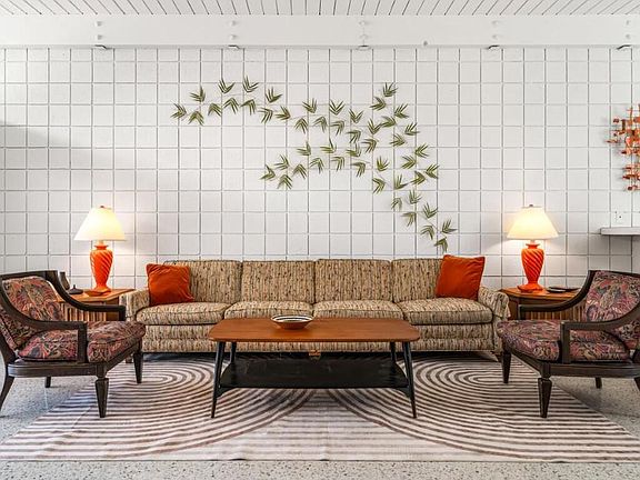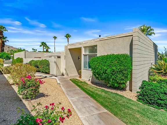 Live your mid-century dream! This 2 BR / 2 BA condo, offering 1,045 sq. ft., is located in the iconic Sandpiper community of Palm Desert. Designed by William Krisel and built in 1960, this home sits within an HOA that carries a historic designation and qualifies for the Mills Act program, which can provide reduced property taxes.High ceilings adorn the major living spaces, where all the original architectural details remain intact: exposed concrete block walls, clerestory windows, tongue-and-groove ceilings, and a flexible accordion wall in the guest bedroom that allows the space to expand into one large great room. The open floor plan is finished with terrazzo porcelain tile throughout and features an original kitchen with pristine vintage cabinets and Formica countertops.The primary suite includes an en-suite bathroom and private patio access, while the second bathroom serves guests and the additional bedroom/flex room.A poolside patio provides a serene retreat with views overlooking the pool, a lush greenbelt, and the northern mountains. The unit also includes a designated covered carport space. The HOA permits short-term rentals of less than 30 days with no minimum stay requirement, making this an ideal vacation retreat or investment opportunity.Just minutes from the shopping and dining of El Paseo, hiking trails, and more--come experience the good life!