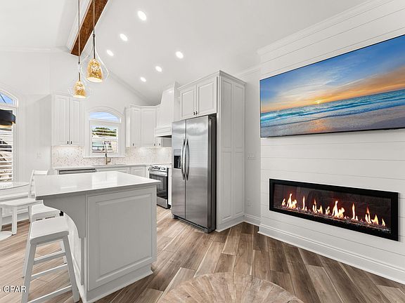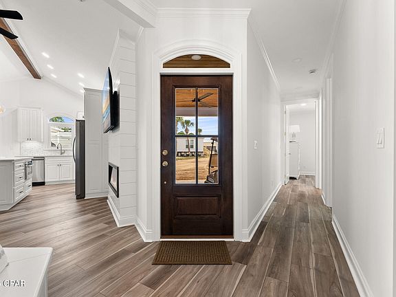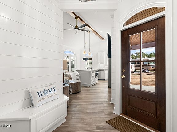 Step into your dream coastal getaway! This gorgeous new 3-bedroom, 2-bath home is perfectly positioned on a corner lot and combines fresh, modern design with the relaxed charm of beachside living. From the moment you step through the solid wood front door, you'll be greeted by bright shiplap walls, elegant flooring, and an open-concept living area designed for effortless entertaining. The living room has vaulted ceilings with exposed wood beams and stylish modern ceiling fan.
