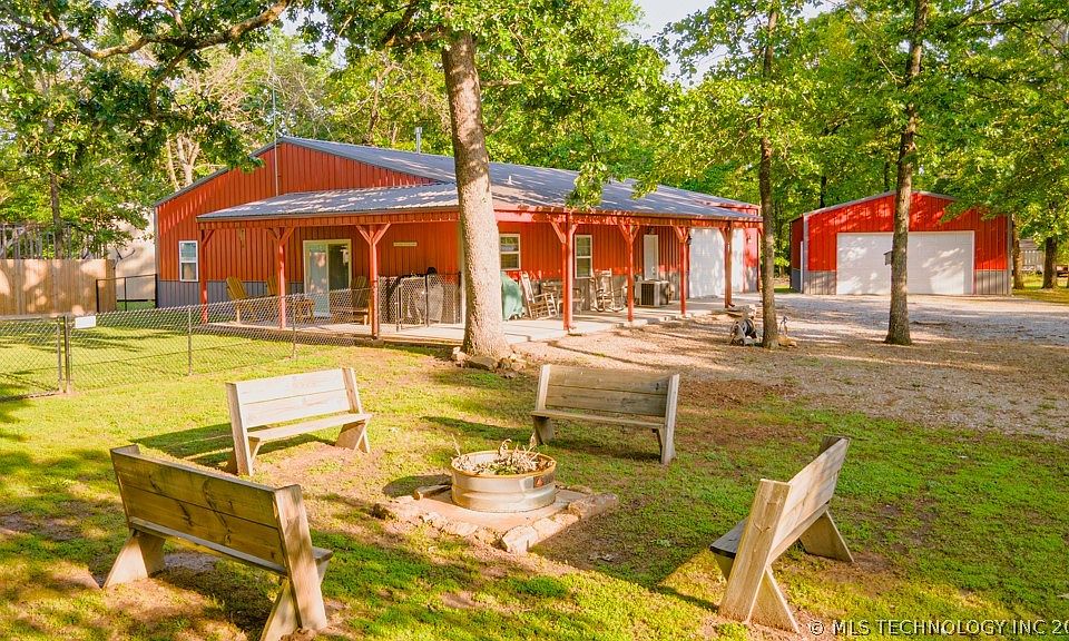 GRAND LAKE, partial view and a Unique opportunity to own a beautiful Barndominium in a quite neighborhood with an attached garage close to Clearwater Bay Marina. Hogans Off Road Park is about 2.5 miles away and the Disney North boat ramp is about 1.5 miles away. The living area is 1200sf mol with plenty of room for all your friends or family. There is an attached garage that is approximately 1080 sqft to park your vehicles and there is a free standing 25x25 shop for that extra storage for all you lake toys. Circle drive for easy in and out and a RV electric hook-up for additional visitors. When you're setting on the wrap around porch or at your fire pit, you have a great view of beautiful trees and a quiet setting. For additional income you can AirBanB this place. HURRY and schedule your viewing before you miss out on this beautiful place.