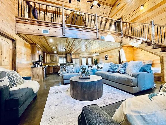 Timber Hills Lodge is an amazing short-term rental cabin with a great proven track record of rental income for the last several years. Located in Broken Bow/ Hochatown, Oklahoma, Just minutes from Broken Bow Lake and Beavers Bend State Park, this prime location offers endless outdoor fun, local dining, entertainment, hiking, fishing, and more. Timber Hills Lodge boasts a large open floor plan with 20-foot high ceilings, a floor-to-ceiling stone fireplace, high-end furnishings, and a great kitchen area with granite countertops, stainless steel appliances, and ample cabinet storage. With six spacious bedrooms and four bathrooms, it’s perfect for a comfortable stay and can sleep up to 21 people. Additional main floor highlights include a primary king bedroom with an en suite bathroom featuring granite-top cabinetry, a large corner tub, large tiled shower, and a walk-in closet. There are two more king bedrooms on the main floor, a second granite-tiled bathroom, and a bunk bed under the stairway for extra sleeping capacity. Upstairs you’ll find a spacious game room loft area with a pool table, arcade games, a pullout sofa, and more. There are also 3 additional king bedrooms, 2 full bathrooms, and a secret bunk room with two beds. When Outdoors you’ll enjoy a Beautiful back porch with fireplace and Hot tub for relaxation, Fire pit area and Swing set for entertainment. Timber Hills Lodge is the perfect dream getaway. Contact the listing agent for more details and to schedule a showing.