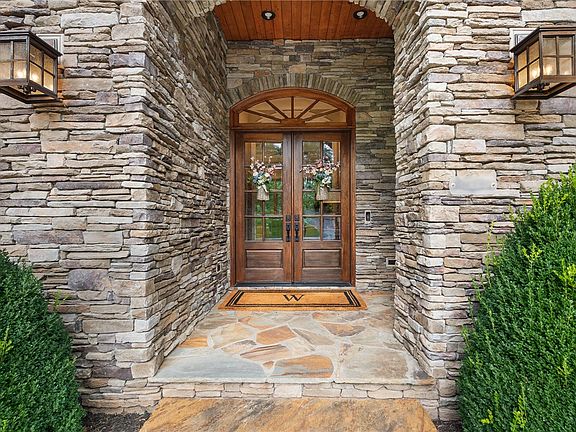 From the moment you step inside, it is clear this property stands apart. Entering through the stacked-stone front porch, you are welcomed by an elegant foyer featuring an arched opening, richly stained oak floors, and 8” cove moulding. The coffered ceiling, inlaid with tongue-and-groove pine, is enhanced by surround sound speakers and adjustable lighting. The striking centerpiece is the stacked-stone fireplace, accented by a honed cedar mantel crafted from a family tree. Expansive windows and french doors on both levels fill the home with natural light while framing magnificent lake views.