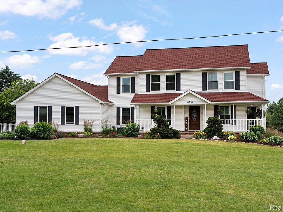 OFFERS ARE DUE BY 7 P.M. ON MONDAY 07/29/2024. Welcome to this beautiful country corner lot, complete with white composite fencing and mature trees for privacy. Enjoy 4.56 acres with a pasture for horses if desire or just picturesque landscaping as current owners are using it. Drive up the winding drive to the home with wrap-around porch to sit and relax on, while enjoying the beautiful green yard w/15-zone sprinkler system. Enter into the front door and there are so many possibilities. A private space for home office or library w/ glass door, formal dining area or sitting room, spacious living room with barn door, built in shelves for farm like & modern features, 2-sided fireplace between the living room and eat in kitchen area. Large kitchen, with plenty of cupboard and counter space. Walk out the door wall to your private fenced pool patio oasis, where you can sit and relax, take a dip in the pool, and listen to music on the outside speakers. The pool is heated and has a newer automated vacuum for convenience and easy maintenance. Unfinished walk out lower level is ready for you to make it your own. There is a 30 x 80 barn with, electricity, 3 horse stalls if needed or use for storage and workspace. New circle drive was added to make driving in and out easy. Other features are as followed; 2021 New Windows and sliding glass doors (Pure Energy), 2024 New A/C, Septic Pumped; All barn and garages have openers, 2023 New Pool Pump motor, 2021 New Water Softener, 2020 New LG Kitchen Appliances, New lighting and ceiling fans, landscaping, close to expressways for easy commutes, School of choice, and so much more. Call today for your private tour.