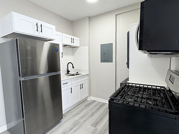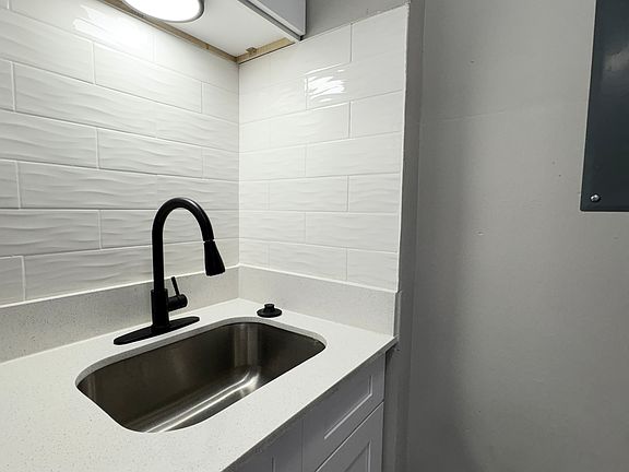 You'll love our sleek and modern kitchen with a black stove and fridge, and white quartz countertops complemented by a stylish backsplash. The white cabinets offer ample storage for all your kitchen essentials, and the black faucet and black cabinet handles add a touch of sophistication.
