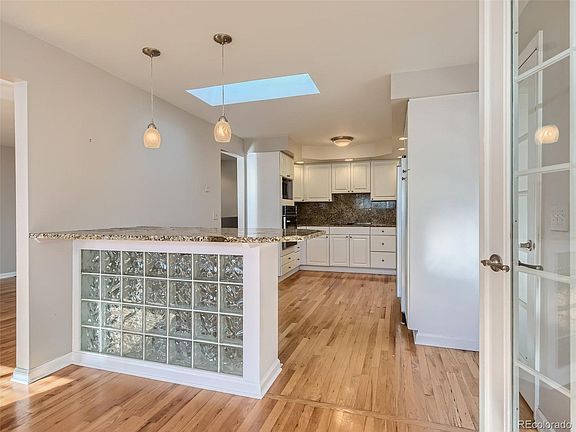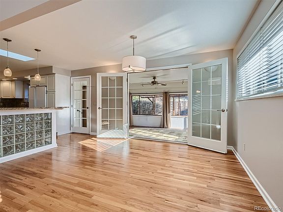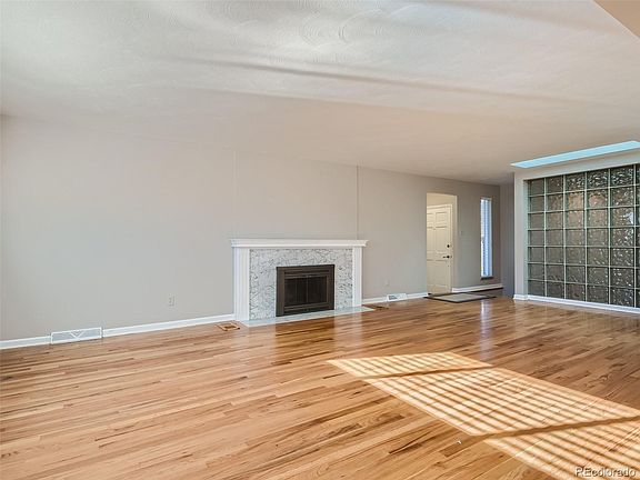 This home has had some great improvements added to it recently. The glass blocks, skylights, updated baths, lighting and the enclosed patio are just some of the finer features within this home. Large rooms allow this to flow well when entertaining or just hanging out. The kitchen and baths have been updated to reflect todays modern lifestyles. Two wood burning fireplaces add to the winter warmth on those chilly days. Three bedrooms and two baths are on the main floor. The fourth non conforming bedroom, office area and the huge family room are in the basement, along with an additional bath. There's also plenty of room for storage in the unfinished space. The laundry area offers a laundry tub for convenience. The two car garage is oversized, creating a perfect spot for a shop area or more storage. The back yard offers a semi-covered patio and an open patio for entertaining. The side yard has plenty of room to play along with a large garden area. This home sits in the middle of the neighborhood, allowing great access to the Light Rail, shopping, restaurants, golf courses and I-225 and I-25.