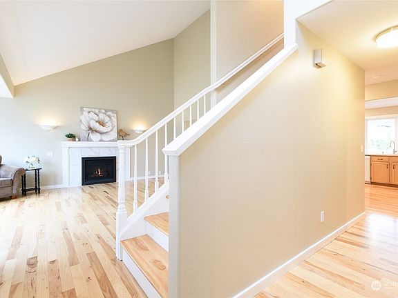 Looking for a property with a Primary Suite on the Main Floor? This desirable floor plan includes a spacious main floor Primary w/5 Piece EnSuite & walk-in closet. You'll love the fresh interior paint throughout, vaulted ceilings, heating grade gas fireplace in the living room for colder days & beautiful, hickory hardwood floors. The open kitchen features a stool height eating bar, quartz counters & tile backsplash. The covered, Trex deck spans the width of the back of the home & is accessible from the dining room slider, as well as the Primary Suite. The fully fenced back yard has a 9'x11' shed w/poured concrete floor & electrical. RV Parking with designated pad, A/C & electric Car Charging Station, NO HOA. Beautiful Mt Rainier Views!