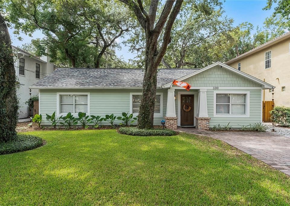 Welcome home to this charming house in the heart of South Tampa! The highlighting feature of this home is its expansive yard space perfect for entertaining, recreation, and pets! On an oversized lot, this home is a unique find for the South Tampa area. Completely renovated in 2021, this home boasts an updated kitchen with white quartzite countertops and stainless steel appliances, updated tile and vanities in both bathrooms and laminate flooring throughout. Other features include a new roof in 2021, new baseboards and fresh paint throughout in 2022 and a new refrigerator purchased in August. When you walk into this home you are greeted with the same inviting warmth that the exterior provides. Natural light fills the living room that allows ample space for a variety of furniture layouts. As you continue through the house, the bright kitchen is laid out in a way that provides efficiency of use, workspace and storage. Further, you step into the dining room or den space that includes a convenient in-home laundry closet and additional pantry space for the kitchen. This home features a split floor plan. The primary bedroom includes an en suite bathroom with closet space complete with storage and organization features, along with two additional bedrooms that offer plenty of natural light, built-in closets and ceiling fans. The guest bathroom includes a tub with shower and updated vanity and tile. Within walking distance of Bayshore, Publix and the YMCA, along with the charm and character of its tree-lined street, this home will not last long! Hurry to see it for yourself!