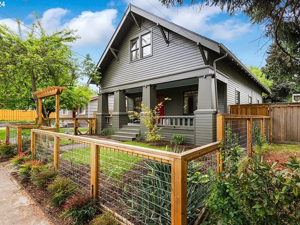 Welcome home to this spacious 4-bedroom, 2-bathroom Craftsman that embodies the essence of Southeast Portland living! High ceilings and hardwood floors welcome you inside, where original wood built-ins pair with tasteful updating. Imagine cozy nights curled up by the Danish woodstove, or refreshing summer mornings picking plums straight from your front yard tree. Upstairs, 3 bedrooms with custom wood and frosted glass doors feature an abundance of natural light that pours through beautiful skylights in the new roof. A spacious tiled bathroom and conveniently located laundry complete the ease of living. The partially finished basement offers great flex space on one side, extra storage and workspace on the other, and even a bonus washing machine for painting clothes or hiking duds. Step onto the expansive covered front porch and watch the world go by, or retreat to the peaceful backyard oasis to tend to the raised garden beds or grill on the new back deck. The tandem garage with updated electrical provides ample room for your outdoor gear or even potential for a future studio space or ADU. Located just a hop, skip, and a jump from countless SE Portland gems like Petite Provence, Sapphire Hotel, Apizza Scholls, the Hinterland Food carts, plus the whole of Foster-Powell! This wonderful home will have you truly living the Portland dream!