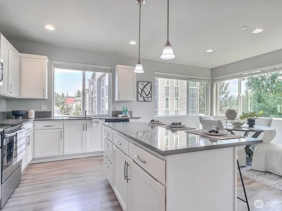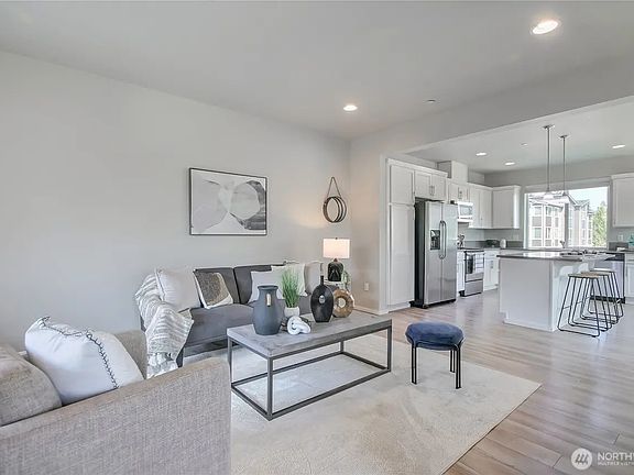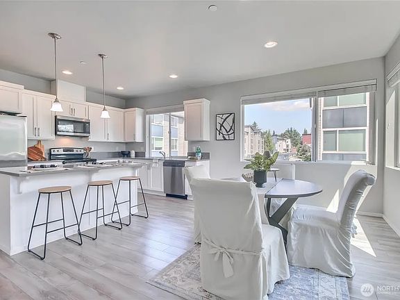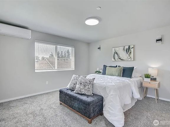 Bright corner-unit offers comfort, style, and value. Park-facing views and oversized windows frame partial Cascade peaks. Ductless mini-split heating & cooling keeps key living areas comfortable year-round. Spacious living room opens to a private deck; light-filled kitchen with ample storage and counter space. Fresh paint, new carpet, and a painted 2-car garage with storage. Prime Lynnwood location near light rail, I-5, 405, shopping, and dining.