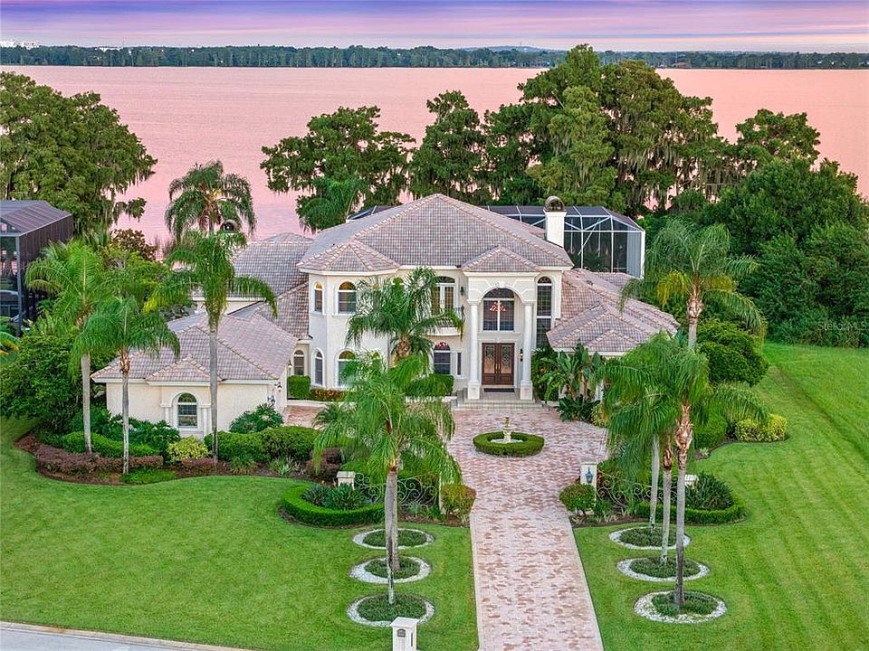 Discover ultimate luxury lakeside living with this remarkable 4-bedroom, 5.5-bath estate in the exclusive, gated community of Heron Cay. Perfectly situated on 1.04 lush acres with 145 feet of private shoreline on Lake Eloise—part of Central Florida’s iconic *Chain of Lakes*, this home offers a rare blend of timeless elegance, exceptional comfort, and breathtaking views. Upon entering, you're welcomed into a grand living room where floor-to-ceiling windows frame panoramic lake views lake and fill the space with natural light. A cozy gas fireplace adds warmth, while the adjacent formal dining room is ideal for intimate dinners or large celebrations. The left wing of the home features a gourmet kitchen with high-end finishes, multiple dining spaces, and a convenient pass-through window to the pool, perfect for effortless entertaining. The expansive great room includes a second gas fireplace, an upscale wet bar, and inviting lounge areas. This side of the home also offers a private office, half bath, and a guest bedroom with en-suite bath. The right wing features two spacious bedrooms with en-suite baths, a large laundry room, and a versatile bonus/game room with sliding doors to the pool and its own poolside-access bathroom, ideal for guests or entertaining. Upstairs, enjoy a built-in library, a private fitness area with floor-to-ceiling mirrored walls, and a lavish primary suite featuring a wet bar, relaxing sitting area, two oversized walk-in closets, and a private balcony with stunning lake and infinity pool views. The spa-like master bath includes a jetted tub, a multi-head shower, bidet, and modern conveniences like built-in drawer outlets for a sleek, clutter-free look. The outdoor living space is designed for luxury and leisure, complete with a summer kitchen, full bar, hot tub, and multiple seating areas with unrivaled lakefront views. As a bonus, enjoy front-row seats to LEGOLAND’s fireworks right from your own backyard oasis. Smart home features include advanced Control4 automation for lighting, music capability in every room, intercom, and front-door communication, plus a full security system for peace of mind. Additional highlights include high-mounted holiday lighting outlets and built-in night lights that softly illuminate your home each evening. Living on the Chain of Lakes offers a one-of-a-kind waterfront lifestyle, with endless opportunities for boating, waterskiing, lakeside dining, and fishing across 20+ connected lakes. Ideally located between Tampa and Orlando, you’ll enjoy quick access to airports, premier medical facilities, shopping, dining, theme parks, and more. Don’t miss this opportunity to own a true lakeside masterpiece. Schedule your private showing today and experience the best of Florida living!