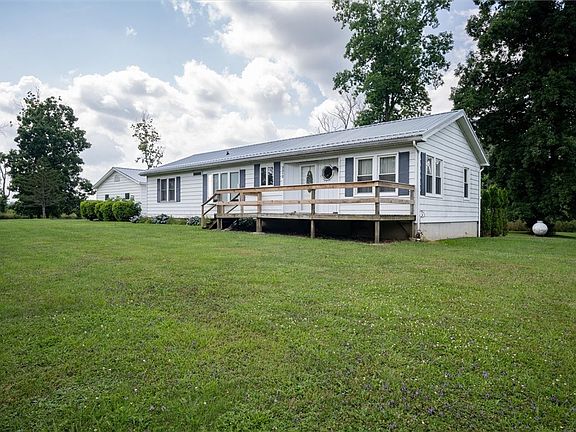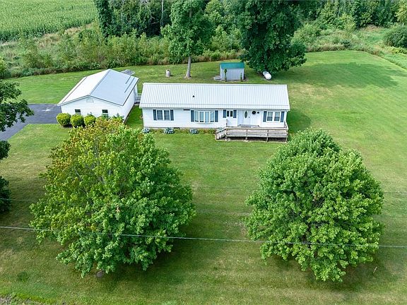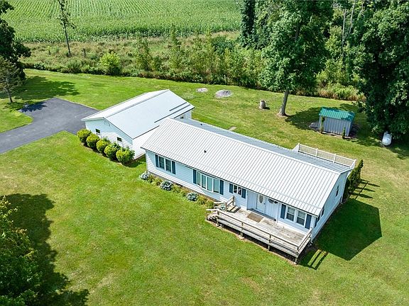 Ranch (1344 SF) on 1 1/2 acres (1.446). Eat-in Kitchen totally remodeled in 2018; Corian Counter Tops, Island, Stainless Steal Appliances (5 Burner Gas Stove)& Ceramic Tiled Flring! 2 Pantries! Primary Bedroom w/remodeled full bath (shower, garden tub, ceramic surround, linen closet, white vanity & pocket door entry). 2 other bedrooms + 2nd full bath. Dining Room open to Living Rm w/Cathedral/Beamed Ceiling. 1st Floor Laundry. Full Poured Basement w/Bilco Door. Forced Air (Propane) & Central Air (both approx 2017), electric baseboard heat available. H2O Heater/Power vent (approx 2020), Replacement Windows throughout. Metal Roof (approx 5 years new), Back Deck (Maintenance Free), Patio and Front Deck. 2 1/2 Car Garage w/ double wide blacktop driveway + Turn Around (approx 2 years new). Extra water hookup by turn around. Well Kept Home!! Delayed Negotiations until Wednesday, 8/23/2023 at 2pm.
