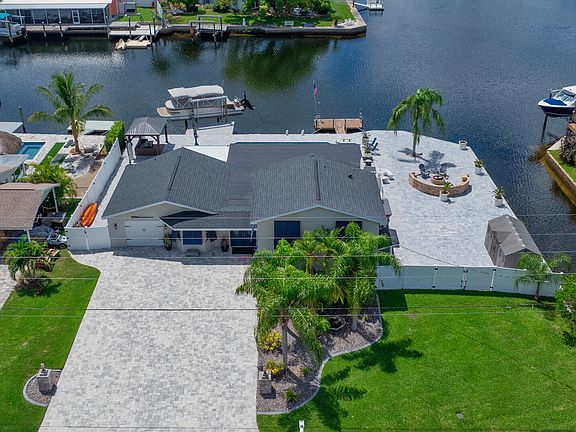 The exterior is designed for entertaining with almost the extire back yard being pavered with mulitple separate areas for entertaining, including a covered pergola, a raised fire pit area, and a large screened porch. Enjoy 194 feet of stunning waterfront with a floating dock, a 13,000 lb boat lift, and a large heated saltwater pool with a spa and full automation system and views down the open canal. Additional amenities include a 1-car garage and a covered grilling area.