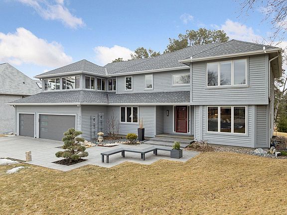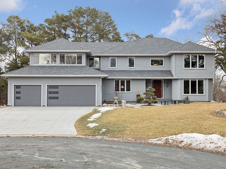 Located at the end of a quiet cul-de-sac in Arden Hills, this spacious single-owner home offers architectural character and modern comfort. A grand staircase greets you upon entry, while Marvin windows fill the home with natural light and views of the landscaped yard. The main floor includes a living and dining room, a kitchen with ample storage, a great room with vaulted ceilings and a wood-burning fireplace, plus an office/bedroom and laundry room. A deck and patio with a landscaped zen garden extend the living space outdoors. Upstairs, four bedrooms and a full bath include a primary suite with a walk-in closet and private bath. A spiral staircase leads to a three-season porch with wood-paneled walls and a freestanding gas fireplace. The lower level, currently used for exercise and storage, has roughed-in plumbing for a future bathroom. Part of an association with a shared beach, dock, and green space, this home is designed for both comfort and future expansion.