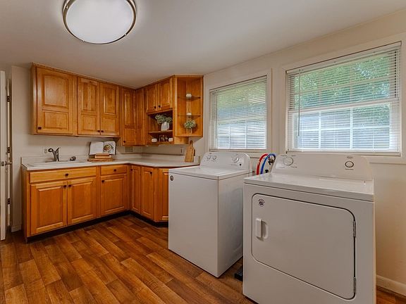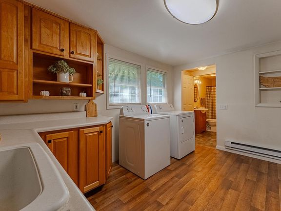 Move in Ready, Affordable and adorable 2 BR, 2 BA home with covered front porch, 1 car attached garage and nice maintenance free exterior. This "right" sized home features a charming kitchen with beautiful wood cabinets and the range, microwave, refrigerator, washer and dryer are included. The large living room features a bay window, wall AC unit for the home and updated steel entrance door. The two bedrooms are spacious with nice natural light and closet space. Handy 2 bathroom set up includes one bathroom with a tub, the second boasts a walk in shower. This darling home is ready for you!