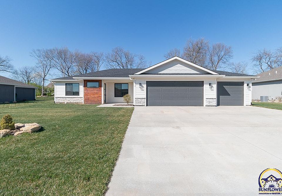 Beautiful home in a newer subdivision close to Lake Shawnee. The open floor plan offers a spacious living, dining, and kitchen area. The kitchen features gorgeous marble countertops with an island and generous upper and lower cabinet space. The Main bedroom includes an en suite bathroom with double sinks and walk-in closet. An enclosed patio space with double doors opens to a walkout patio and a great backyard area for hosting. Extra storage space is available in the large utility room as well as excellent space in the oversized triple car garage.