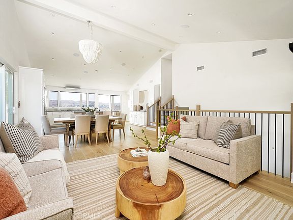Discover this elegant home in Dana Point, offering breathtaking views of the ocean, mountains, and sparkling city lights. Beautifully remodeled and expanded in 2022, every detail has been thoughtfully designed with high-end finishes. The open floor plan creates a welcoming atmosphere, anchored by a large great room with vaulted ceilings that spans the entire main level. Wide plank, French oak hardwood floors are beautifully featured through the home. The generous kitchen offers a large center island with ample seating, stunning quartz countertops, custom cabinetry, and top-of-the-line stainless steel appliances, all complemented by panoramic views from the many windows. Abundant natural light fills the home, enhancing its open and inviting feel. The expansive primary suite includes a private balcony, a large walk-in closet, and a luxurious bathroom with a walk-in shower, dual vanities, and a soaking tub. Two additional bedrooms offer unique features—one with a built-in bookcase and the other with a Murphy bed. The downstairs level is impressive with a large bedroom, perfect as a second master suite, complete with its own private nook and full bath, including dual sinks and an upgraded shower. The home also boasts a three-car direct access garage and sits on a sizable lot with a private backyard featuring a spacious patio, a putting green, and ocean views. New HVAC system, ducting, windows & doors plus a whole home water filtration system! Situated in a no-HOA neighborhood, it’s just a short bike ride to Dana Point Harbor, Lantern Village, and world-class beaches and shopping. This home truly embodies the best of coastal living.