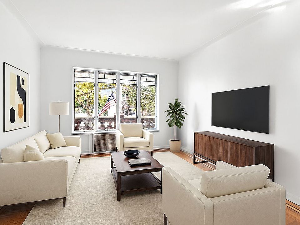 Spread across the garden and parlor levels, the lower owner's duplex provides the feel of a true single-family home. Every room is windowed and naturally lit. The parlor floor offers a sunlit living room with parquet floors, arched entryways, and a formal dining room. The central eat-in kitchen is a natural gathering area. Downstairs in the fully finished basement is a bright and versatile living room with full ceiling heights and direct access to the garden. The front section can be converted into an indoor garage if desired.
