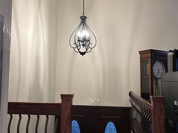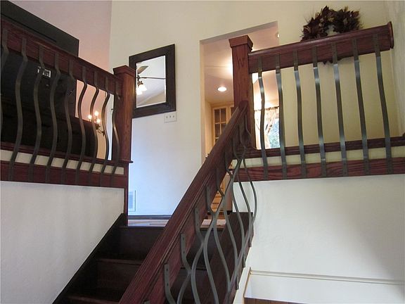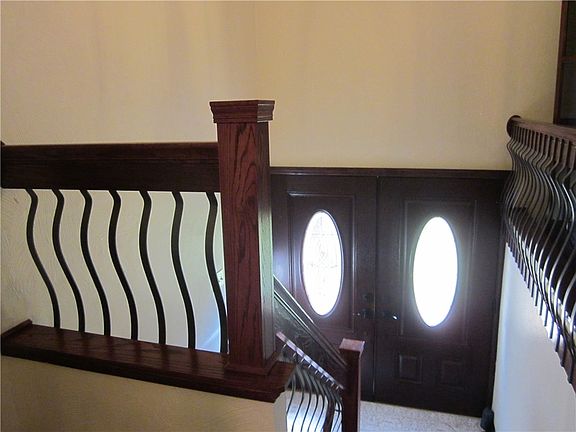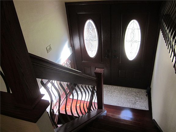 Privacy country living but minutes from Burrell and a perfect brick split entry & fenced in yard , large entrance landing w/ arched iron designed railing and beautiful hardwood dark stained cherry steps to cathedral ceilinged living room freshly painted w/ large Pella window
