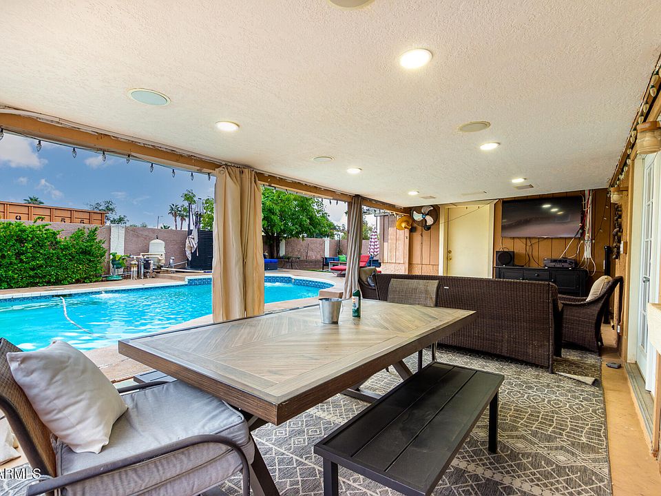 Sparkling blue poolTasteful stone accentsButcher block countersHerringbone tile backsplashBuilt-in appliancesLarge covered patioBuilt-in bbq