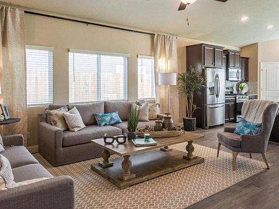 Lennar New Construction - Bristlecone 1989 A - California Series at Gossamer Grove in Shafter, CA. This single-story home has a convenient layout that works well for busy families. Three bedrooms share a bathroom at the front of the home, before the open Great Room, dining area and modern kitchen. Off the open living area is the owner's suite with a full bathroom and two walk-in closets. California Series is a collection of new homes for sale at the Gossamer Grove masterplan community in Shafter, CA. Offering a laidback and family-friendly atmosphere with engaging onsite amenities, the community is surrounded by restaurants, shopping centers and is less than four miles from Studio Movie Grill, River Lakes Golf Course and Meadows Field Airport. Homeowners can enjoy a variety of onsite amenities and students of the community attend the top-rated Norris School District.