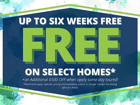 - Special offer! Up to Six Weeks Free on select homes! +an Additional $500 OFF when apply same day toured! *Restrictions apply. Specials, pricing and availability subject to change. Contact the leasing office for details.