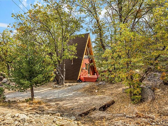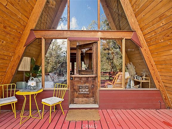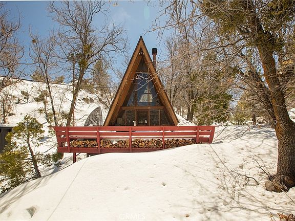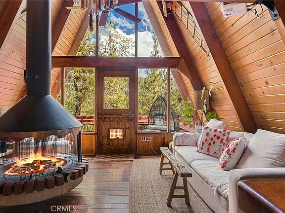 A quintessential A-frame perched on the hillside with convenient access to nearby ski resorts. Surrounded by oak trees, you will love the rugged setting of this whimsical cabin. Enter from either the spacious front deck, or the kitchen's back door to find an intimate open plan kitchen & living room space with large focal original circular fireplace and a wall of floor to ceiling windows. Rustic elements inside echo the mountain landscape outside - slate tile counters and pine wood cabinets with natural bark accents, and original hardwood floors. Also on this level is a full bathroom with cohesive design aesthetics throughout. Up the ladder to a loft bedroom with soaring vaulted ceiling and beautiful windows to enjoy the outdoors while cozied up in bed. There's also a cute back deck off the kitchen and a trail behind the home that leads to Arrowbear Lake. Ample, easy parking. Recent upgrades include a new electrical panel, furnace, stove and water heater. Successful STR rental history.