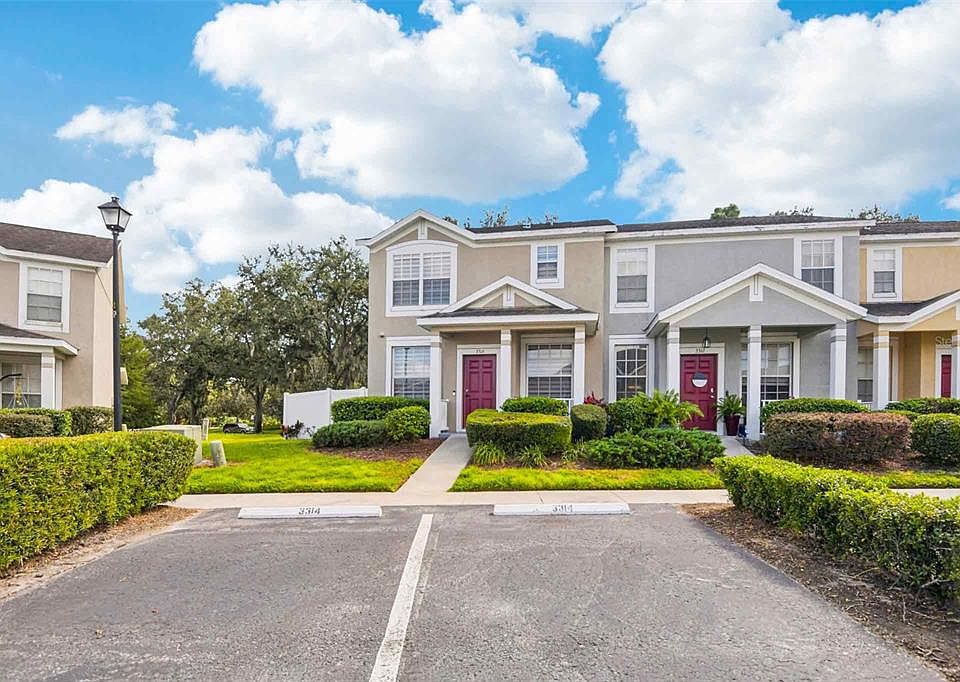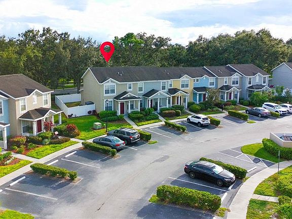 This townhome stands out as one of the largest floor plans in Stagecoach Village, offering 3 full bedrooms and 3 full bathrooms in a gated, amenity-filled community. The unique layout includes a first-floor bedroom and bath, ideal for guests or a home office. Sitting on a corner lot with a large fenced backyard—rarely found in townhome living—this property provides outdoor space perfect for pets, entertaining, or simply relaxing. Inside, you’ll find modern updates throughout, including newer laminate floors, a custom pantry with barn-style door, a smart thermostat, and upgraded lighting with dimmers and motion sensors in select areas. The living and dining areas flow into the kitchen and family room, while sliding doors open to a covered and screened lanai with epoxy flooring. Luxury curtains and shades add a refined touch, and the no-carpet design ensures a sleek, low-maintenance appeal. Upstairs, two spacious suites each feature private bathrooms and walk-in closets. This home also comes with two assigned parking spaces conveniently located right in front of the unit, plus plenty of guest parking available across the street. Community amenities include a pool, playground, and basketball courts, all just minutes from I-75, the Tampa Premium Outlets, restaurants, and more. A true move-in ready home that blends space, comfort, and style!