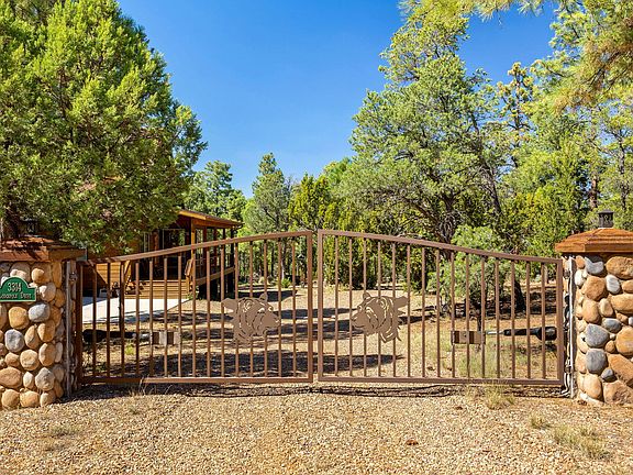 Nestled among towering pines, this stunning house of windows offers spectacular views in a private, secluded setting on 1.25 acres. With 3 bdrms & 2 baths, this home features two master suites, one on each level. The third bedroom, accessible thru upstairs master huge walk-thru closet, functions as an office, nursery, or craft room. Inside, enjoy a loft accented by beautiful peel pole log railing, vaulted T&G ceiling, & stone-faced floor to ceiling fireplace. The property showcases knotty oak cabinets & stain-grade interior doors & trim, while the outdoor space is designed for entertaining, featuring 10-foot wrap-around Trex deck on two sides of property, an outdoor kitchen w/refrigerator, sink, & BBQ, as well as a paver patio seating area. Relax in the hot tub, swing on the deck or enjoy fun games like putt-putt golf & bocce ball. The property also includes an 8x10 greenhouse, a gardening shed w/sink, & a 12x30 insulated shed w/metal roof. Additional features include an attached oversized two-car garage w/pellet stove, a fenced yard, & a stunning remote-operated security gate. With over 10 fruit trees & a landscaped backyard adorned w/honeysuckle vines & flowers, this low-maintenance home is a rare gem—only a few hundred yards of privately maintained gravel road, located at the end of a paved subdivision w/no HOA & horses allowed! Must See!!