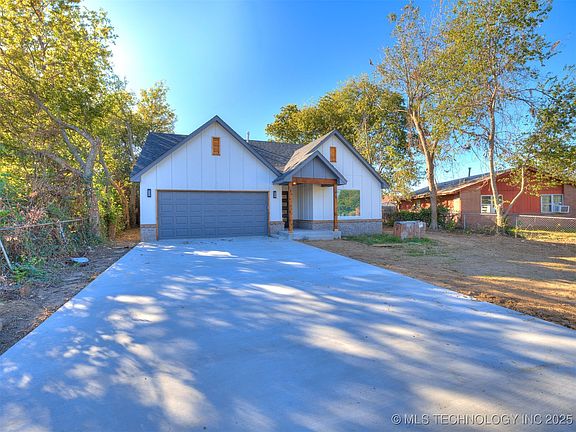 Stunning brand-new modern farmhouse located on a cul-de-sac, featuring a long driveway and a wide fenced side gate ideal for extra parking, boats, or trailers. This home offers an open layout with high ceilings, great natural light, and an inviting fireplace insert in the living area. The kitchen boasts granite countertops, a large island, double sink, spacious pantry, and elegant finishes that blend modern design with timeless charm. The primary suite includes a walk-in closet and a stylish bathroom, while all bedrooms are spacious and comfortable. Additional highlights include beautiful flooring throughout, ceiling fans in every room, hidden TV cord wiring, wide hallways, and a covered back porch perfect for relaxing or entertaining. The home also features an overhead garage door with remote access. Conveniently located near the BOK Center, The Gathering Place, Tulsa International Airport, The University of Tulsa, and Hillcrest Medical Center, this property combines elegance, functionality, and excellent accessibility.
