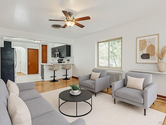This stunningly updated 1940 row home perfectly combines historic character with modern comfort in one of Denver’s most sought-after neighborhoods. Step inside to an open-concept floor plan filled with natural light, featuring gleaming wood floors, a welcoming living room with large picture windows, and a beautifully renovated kitchen designed for both style and functionality. The kitchen showcases stainless steel appliances, tile flooring, a built-in breakfast nook, ample cabinetry and pantry space, and a breakfast bar for additional seating. Two inviting bedrooms and a fully remodeled bathroom complete the main level, creating a comfortable and efficient layout. Downstairs, the versatile finished basement offers incredible flexibility—ideal for a media room, home office, guest suite, or family room. The lower level also includes a spacious laundry area with a utility sink, built-in shelving, and plenty of storage space. Outside, enjoy multiple outdoor living areas, including a covered front porch, a private fenced backyard, and a covered patio with additional seating, perfect for relaxing or entertaining. The detached one-car garage and ample street parking add convenience and functionality. Located on a quiet street just minutes from City Park, the Denver Zoo, RiNo Arts District, downtown Denver, Cherry Creek, and local restaurants and cafes, this home offers the perfect balance of urban accessibility and neighborhood charm. Experience the best of Denver living in this move-in-ready, beautifully updated row home with timeless appeal and modern upgrades throughout.