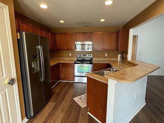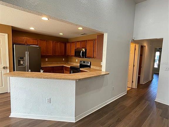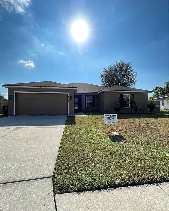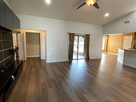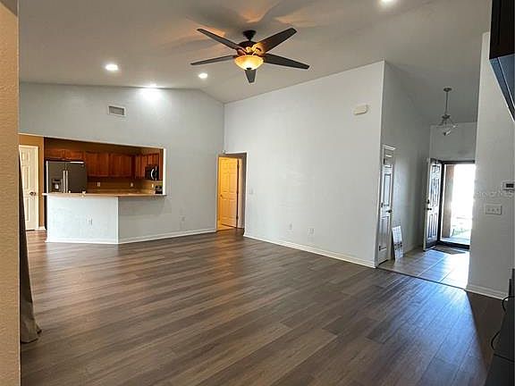 Step into comfort and space with this well-maintained 4-bedroom, 2-bath home featuring a 2-car garage and an open floor plan designed for easy living and effortless entertaining. The spacious layout offers plenty of room to spread out, with generous living areas that feel open, bright, and welcoming. Enjoy a 105 sq. ft. screened-in patio overlooking a HUGE backyard, perfect for relaxing, hosting gatherings, or unwinding outdoors. The large covered lanai adds even more outdoor living space, giving you a great setup for entertaining inside and out. Flooring throughout the home is laminate or tile no carpet offering easy maintenance and a clean, modern feel. Security cameras will remain with the property, and tenants will be given full access. The primary suite features a soaking tub and double sinks, with dual vanities also included in the guest bathroom. Additional inclusions are planter beds, a pool table, an entertainment center, and an outdoor TV. Located within 10 15 minutes of major roadways, shopping, dining, and everyday necessities, this home offers space, comfort, and convenience in a great location. The play set will be removed, and select areas of the home will receive fresh paint.