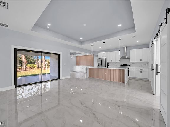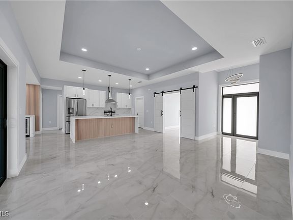 Porcelain tile flooring throughout the home for a sleek, low maintenance required. Kitchen and bathrooms with quartz countertops and stainless-steel appliances, Wood cabinets, double vanities in the master bathroom, custom shower and walk-in closet. Tray ceilings adding style and spaciousness. Extended patio and sidewalk surrounding the entire property, connecting to the driveway—perfect for outdoor. Doble car Garage with extra Side exit door for convenience. Dining room with extra Counter-Top and wine cooler, ideal for entertaining family and friends. This house come with an Oversize Lanai and summer kitchen already added, perfect for outdoor activities. This corner lot offered a prime location in Lehigh Acres. close to schools, parks, and shopping.