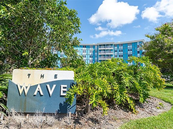 Boat and Beach Lover's Dream! This property is in great condition, has been well maintained and is move in ready. Lovely, 1 bedroom, 1 bath, 708 square foot unit located on the 5th floor. Open concept complete with a large balcony which provides plenty of light. Walk into a good size living room with tile flooring and built in shelves. Kitchen has tile flooring, lots of white cabinets, a nice stone backsplash, and a breakfast bar. Dining area is next to the living room and kitchen and has tile flooring and direct access to the balcony. The Wave association has resort style amenities including: a gym, two laundry rooms, a large pool. community BBQ, a sitting area, mailboxes in the lobby. The unit has one assigned parking space #110. This property would be a great primary residence or rental! Only 7 minutes to St. Petersburg Beach and Pass-A-Grille Beach. The Wave is directly across from Loggerhead Marina & Freedom Boat Club which offers Gulf access. There is a free boat launch just minutes from the parking lot at Maximo State Park with access to Boca Ciega Bay. Conveniently located just seconds away from I-275 and the Skyway Bridge. Eckerd College is in close proximity as well.
