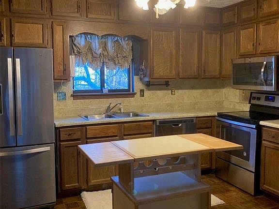 Finished day basementWood burning stoveWalk-in closetTiger oak kitchen cabinetsCorner lotDouble mirrored armoireNew ceiling fans