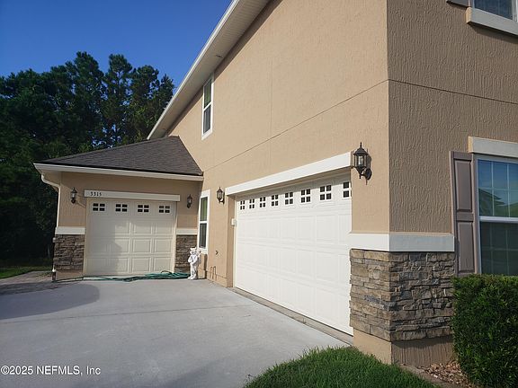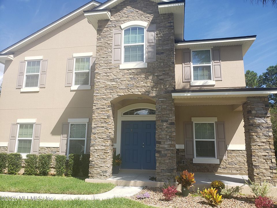 Beautiful stone accented Wellington B Dream Finders home featuring 5 Bedroom 3.5 Baths plus Bonus/Room with it's own half bath. Superior curb appeal w courtyard entry 2 car garage and separate 1 car garage. Pavers extend from garage throughout back displaying gorgeous pavered terrace overlooking tranquil private backyard. Inviting rock plant beds extend from front and right side throughout back to add charm. This home displays versatility and delightful open fully equipped kitchen, breakfast room and family room. Bedroom, bath off back screened porch perfect for entertaining on huge pavered terrace an ideal in-law suite. Upstairs massive master suite includes his and her walk in closets, walk in shower, double vanities along with corner garden tub. Bedroom 5 includes a play area, loft has multiple uses, Bonus Room/Office/ Media Room has it's own half bath, maybe 6th BR. Golf, Tennis, Club House Restaurant, Olympic size Pool. Most pleasant home for any size family needs from nursery play area for young children to home office, to media room, or in law suite downstairs or upstairs. You will love the pavered terrace overlooking tranquil private backyard or just sit on the front porch. Screened porch off terrace for rainy or cool days to just sit and enjoy nature. This is truly a home for every family member. Take a few minutes to view the "documents" to get acquainted with how marvelous this golf course community truly is. Fantastic pool, club house, tennis courts, and restaurant with pub. Great family enjoyment all in a quiet laid-back back environment. Seller offers a quick close. Call to tour today!